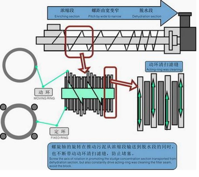3、自清洗:螺旋軸的旋轉(zhuǎn),推動游動環(huán)不斷轉(zhuǎn)動,設(shè)備依靠固定環(huán)和游動環(huán)之間的移動實現(xiàn)連續(xù)的自清洗過程,從而巧妙地避免了傳統(tǒng)脫水機普遍存在的堵塞問題。